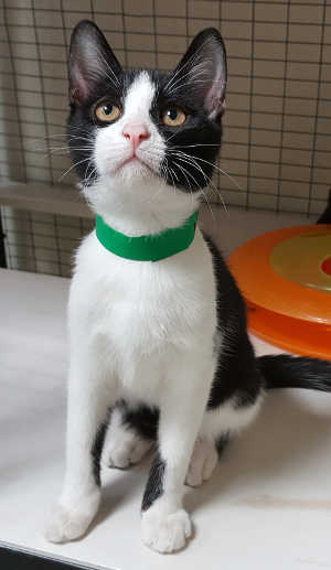 This female domestic short hair kitten has a black and white coat and gold eyes.