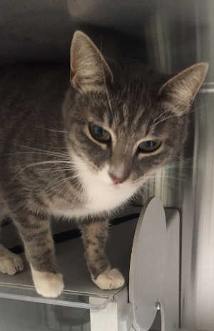 This female adult domestic short hair cat has a gray and white coat and gold eyes.