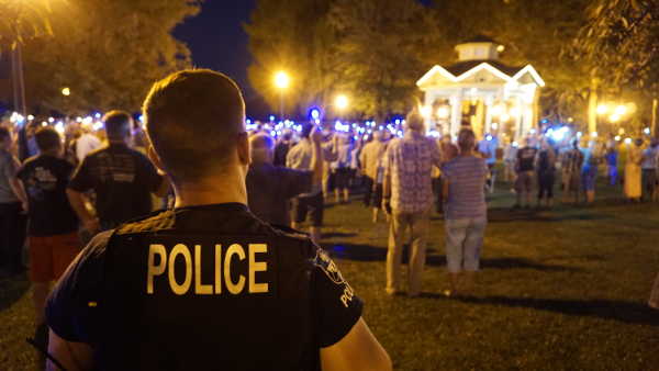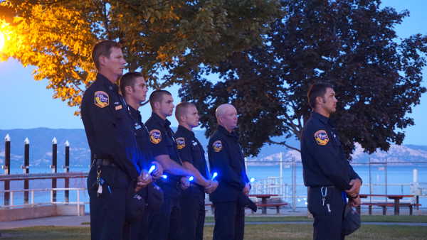 A Lakeport Police officer looks on during the vigil for fallen Lake County Sheriff’s Deputy Rob Rumfelt on Tuesday, August 29, 2017, in Library Park in Lakeport, Calif. Photo by John Jensen/Lake County News. As a result, debriefing and counseling have been taking place for first responders and law enforcement officers, a process assisted by the sheriff’s chaplain team.