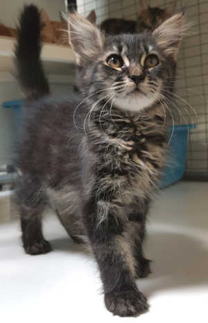 This female domestic medium hair mix kitten has a gray tabby and black coat and gold eyes.