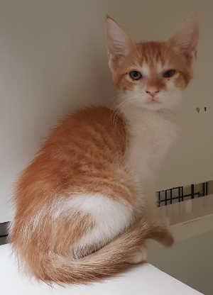 This male domestic short hair kitten has an orange tabby coat and gold eyes.