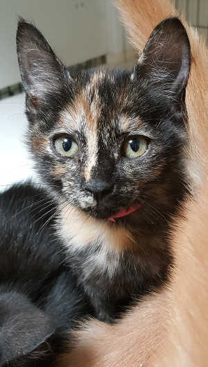 This female domestic short hair kitten has a tortie coat and gold eyes.