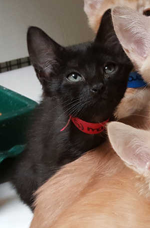 This male domestic medium hair mix kitten has a black coat and green eyes.
