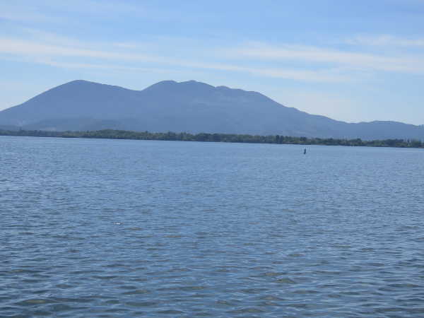 Mount Konocti, a dormant volcano resting on the Pacific Ring of Fire, emerges on the shoreline across the narrows, rising to 4,305 feet.