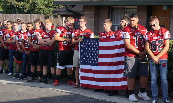 Clear Lake High School football players look on as a hearse arrives bearing the body of Lake County Sheriff’s Deputy Rob Rumfelt on Thursday, August 24, 2017, in Lakeport, Calif. Rumfelt had served as an assistant football coach at Clear Lake High School. Photo by Elizabeth Larson/Lake County News.