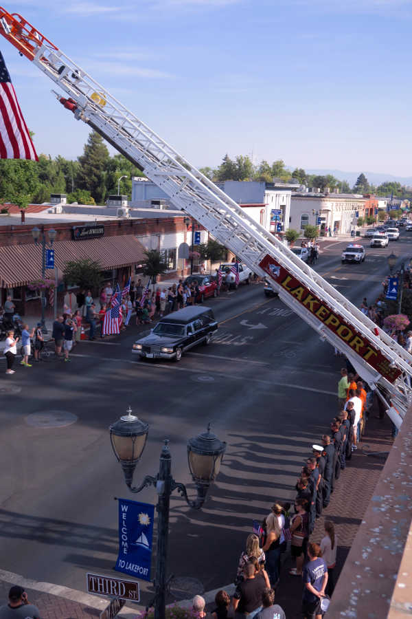 On through Kelseyville they traveled, and then to Lakeport, where the procession drove the length of Main Street. Lakeport Public Works Director Doug Grider and his crew made sure that American flags dotted the route in honor of Rumfelt’s service not only in law enforcement but in the US Marines.