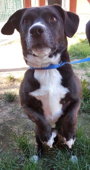 “Satchel” is a male border collie and Labrador Retriever mix with a short black and white coat.
