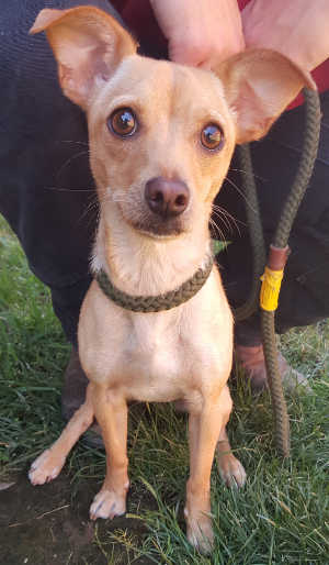 “Minnie” is a Chihuahua mix with a short tan coat.