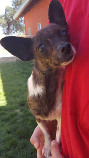 This female Chihuahua has a short brindle and white coat.