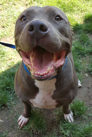 This young male pit bull terrier has a short blue and white coat.