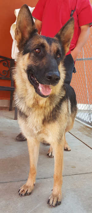 “Canela” is a female German Shepherd with a medium-length black and brown coat.
