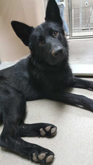 This young male German Shepherd has a short black coat.