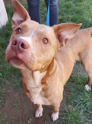 “Moose” is a male pit bull terrier mix with a short red and white coat.