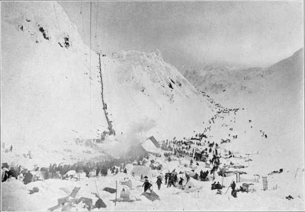 The first stampeders, led by native guides, cut steps into the ice-covered slopes leading up to the pass.