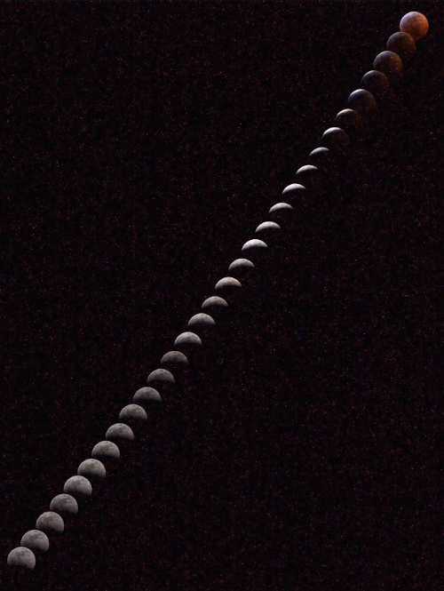 The phases of the 2019 total lunar eclipse as captured by Dr. Renee Weber in a time-lapse image in Huntsville, Alabama. “I used a DSLR camera with a standard zoom lens mounted on a tripod with a remote timer, and took pictures every two minutes,” Weber said.