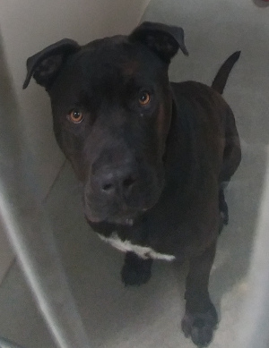 This male Labrador Retriever-Rottweiler mix has a short black coat with white markings.