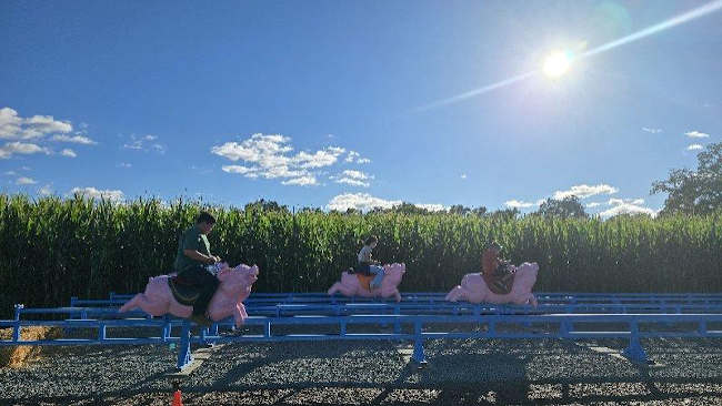 The vibrant orange of the pumpkin patch pops against the backdrop of tall, green corn stalks, with whimsical pink pig rides flying across the scene — colors that capture the essence of fall and fun.