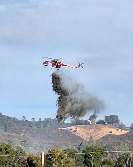 A helicopter drops water on a wildland fire near Kelseyville, California, on Wednesday, Oct. 9, 2024. Photo by Karen Sullivan.