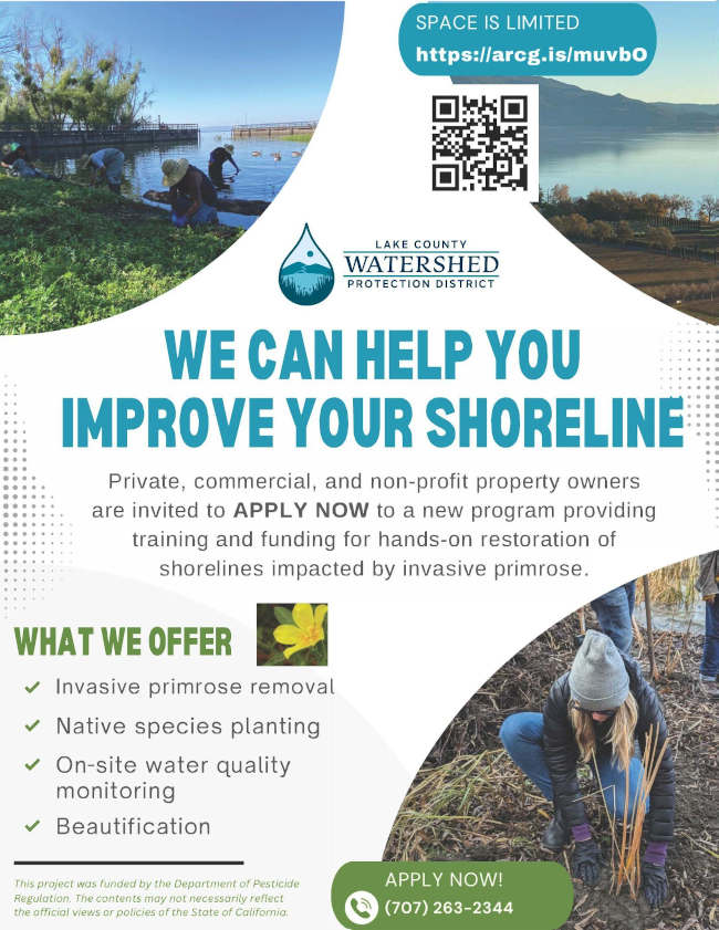 We’re looking to recruit landowners willing to roll up their sleeves and work alongside County and Watershed Protection District staff and contractors to remove invasive species, plant native species like tule, and beautify and landscape your shorelines to be more ecologically resilient. Partial or full subsidies are available for invasive primrose removal and replanting areas with native plant communities.