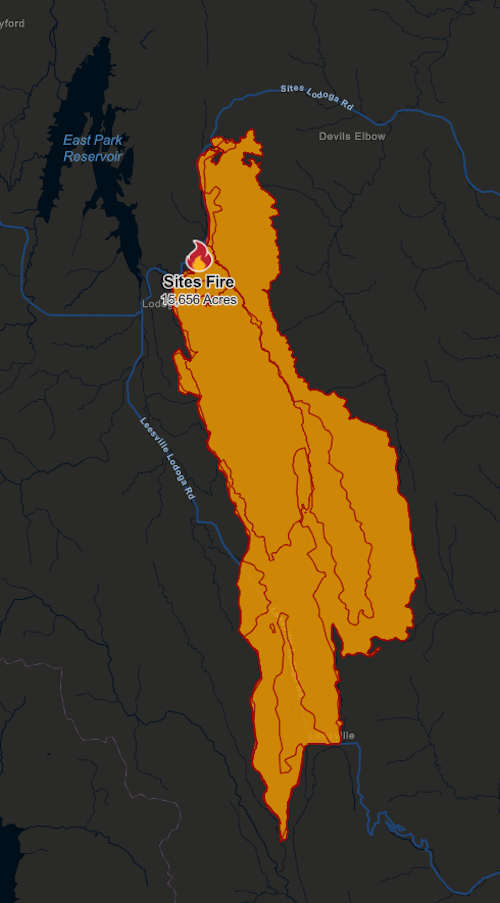 On Tuesday, evacuation orders were issued for Leesville Lodoga Road South to Leesville Road, Leesville to Huffmaster Road, Huffmaster Road to Maxwell Sites Road, Leesville Road to Antelope Valley Ranch and North from Antelope Valley Ranch, and Sites Lodoga Road at Sites, where there is a hard road closure.