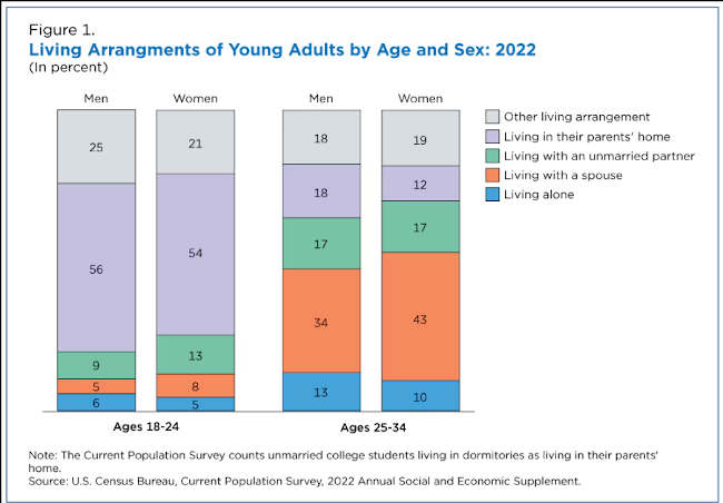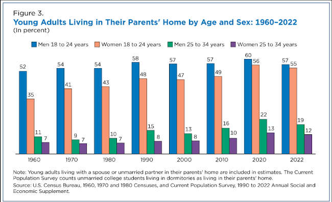 In 1960, just 11% of men and 7% of women in that age group lived with their parents. By 2022, 19% of men and 12% of women were living in their parents’ home.