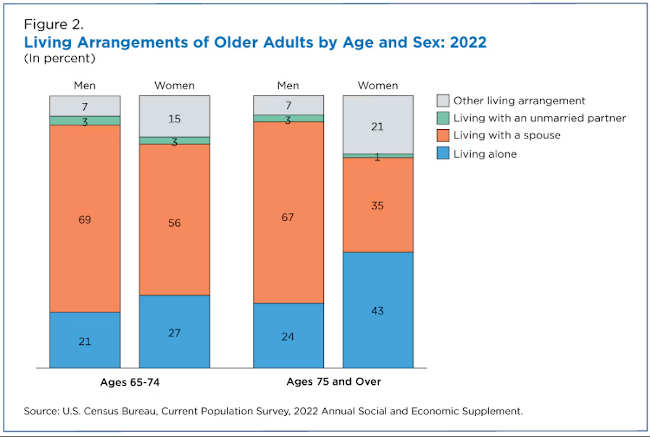 Among older adults, about 27% of women ages 65 to 74 and 43% of those age 75 or older lived alone (Figure 2).