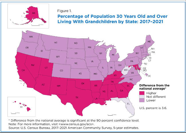 Using 2017-2021 American Community Survey, 5-year estimates, Figure 1 shows the percentage of the population age 30 and over who lived with grandchildren under the age of 18 and whether the estimate for each state differed significantly from the national average.