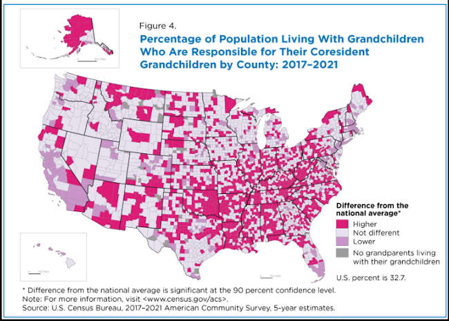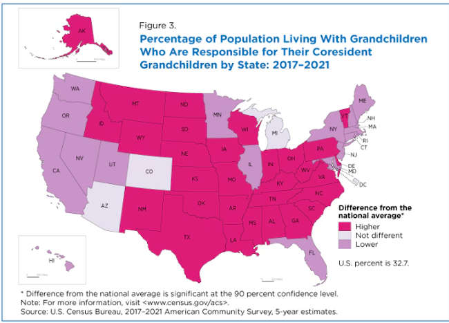 The South, for example, has a higher percentage of Black or African American populations in the region who have a relatively high rate of living with grandchildren.