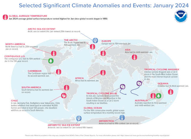 January also saw a record-high monthly global ocean surface temperature for the 10th-consecutive month. El Nino conditions that emerged in June 2023 continued into January, and according to NOAA's Climate Prediction Center it is likely that El Nino will transition to ENSO-neutral by April–June 2024 with increasing odds of La Nina developing in June–August 2024.