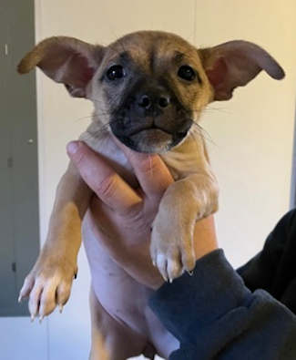 The adoptable dogs include two litters of puppies, one of which is “Fawn,” who is 2 and a half months old, with a blonde and black coat.