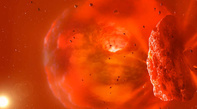 In a new study detailing these events, scientists suggest that two giant exoplanets anywhere from several to tens of Earth masses crashed into one another, creating both the infrared spike and the cloud. A crash like this would completely liquify the two planets, leaving behind a single molten core surrounded by a cloud of gas, hot rock, and dust.