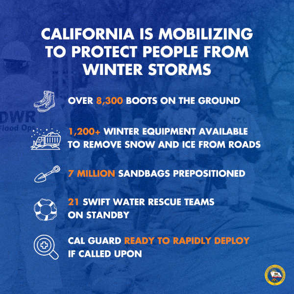 Gov. Gavin Newsom announced that California has mobilized more than 8,300 boots on the ground ahead of the next set of winter storms anticipated to bring serious impacts to much of the state this weekend and into early next week.