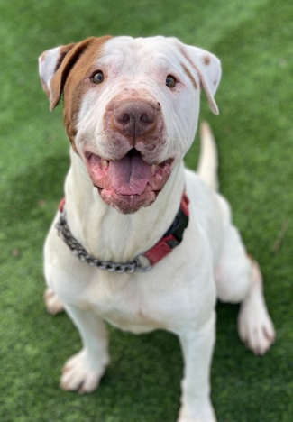 The adoptable dogs include “Rock,” an American Staffordshire terrier mix with a white and brown coat. He has been neutered.
