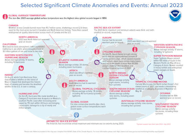 • Polar sea ice was scant: The 2023 annual Antarctic sea ice extent (coverage) averaged 3.79 million square miles in 2023, the lowest on record. The maximum extent in September was 6.55 million square miles, which was the lowest by a record margin. The minimum extent in February was 690,000 square miles, which set a record low for the second consecutive year. Arctic sea ice coverage averaged 4.05 million square miles in 2023, ranking among the 10 lowest years on record. The maximum extent in March was 5.64 million square miles, which ranked fifth lowest, while the minimum extent in September was 1.63 million square miles, which ranked sixth lowest.