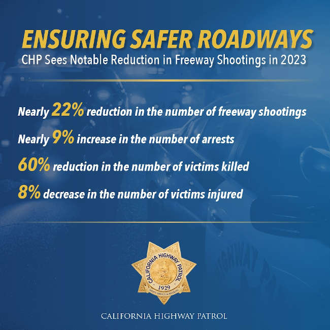 Reflecting the good work that contributed to these reductions, the number of arrests by the CHP in freeways shootings increased nearly 9% from 2022.