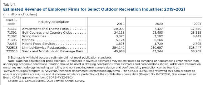 The U.S. Census Bureau’s Service Annual Survey, or SAS, provides a detailed look at estimated revenue of employer firms for select indoor and outdoor recreation industries affected by COVID-19 and a glimpse into their recovery.