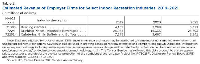 For example, Bowling Centers’ revenue dropped 46.2% (from $4.1 billion in 2019 to $2.2 billion in 2020), and Cafeterias, Grill Buffets, and Buffets’ revenue declined 49.3% (from $7.3 billion in 2019 to $3.7 billion in 2020).
