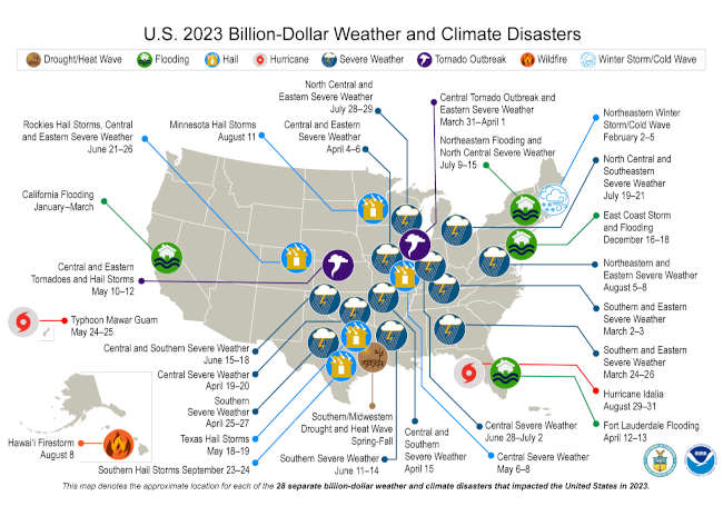 • 2 tropical cyclones (Idalia in Florida and Typhoon Mawar in Guam).