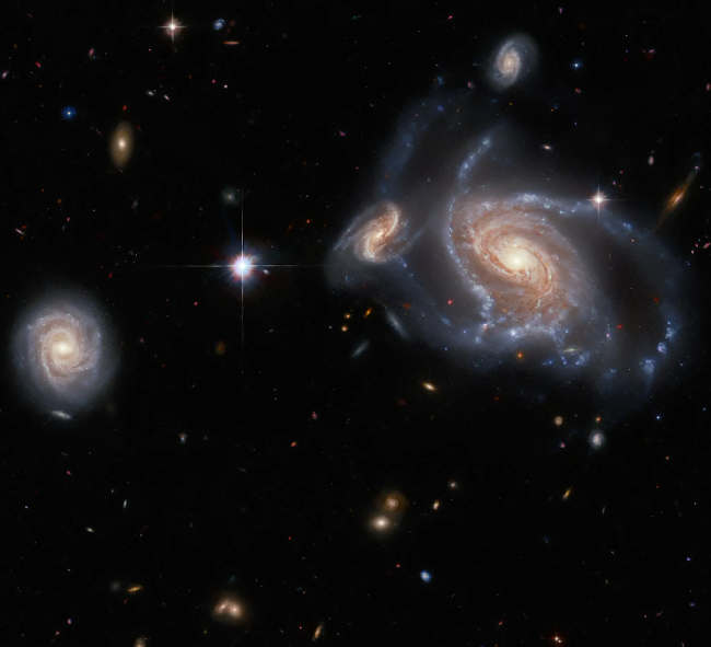 This image from the NASA/ESA Hubble Space Telescope features a richness of spiral galaxies: the large, prominent spiral galaxy on the right side of the image is NGC 1356; the two apparently smaller spiral galaxies flanking it are LEDA 467699 (above it) and LEDA 95415 (very close at its left) respectively; and finally, IC 1947 sits along the left side of the image.