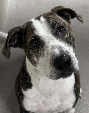 Another dog ready for her new home is a 3-year-old female pit bull terrier with a brindle coat with white markings. She is in kennel No. 20, ID No. LCAC-A-6103.