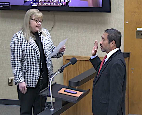 As the Board of Supervisors looked on, County Administrative Officer Susan Parker administered the oath to Raymond Buenaventura.