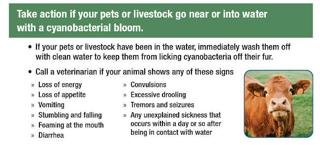 And lastly, if you think your pet has been exposed and is becoming sick or ill from being in the water, take them to your veterinarian immediately. Make sure to tell the vet that the pet was in a natural water body and exposed to cyanotoxins.