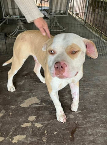 There also is “Winston,” a 1-year-old male American pit bull terrier mix with a short white and tan coat.