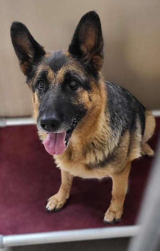 This 1 and a half year old male shepherd has a short tricolor coat.