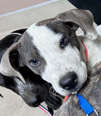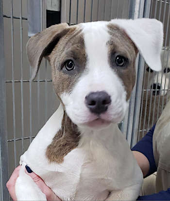 This 6-month-old male hound-pit bull terrier puppy has a white coat with gray markings.