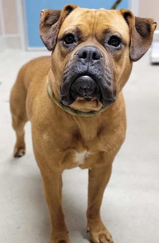 “Chikis” is a 5-year-old female boxer with a short brown coat.