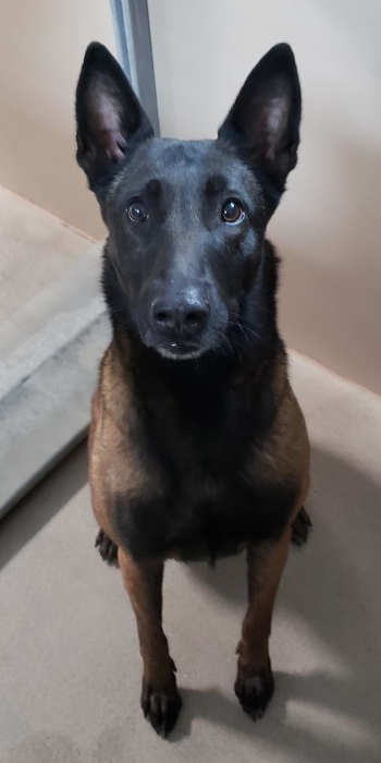 “Xina” is a 3-year-old female Belgian malinois with a brown and black coat.