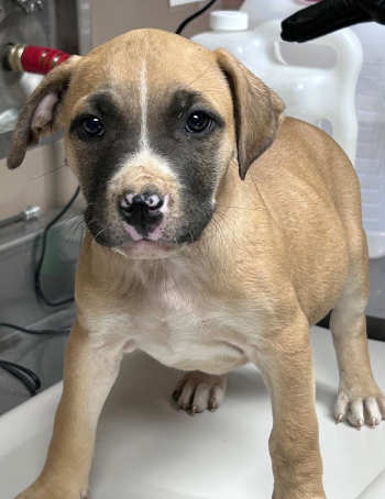 This 2-month-old male boxer-pit bull puppy has a short tan coat with black and white markings.