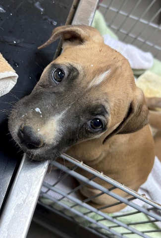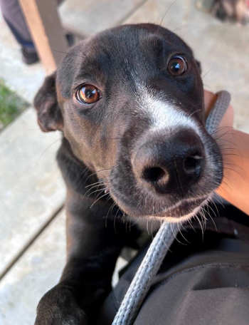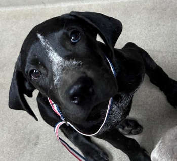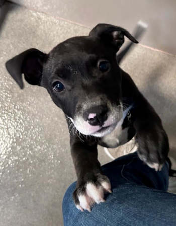 “Max” is a 6-month-old male pit bull terrier-hound puppy with a black coat with white markings.