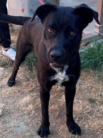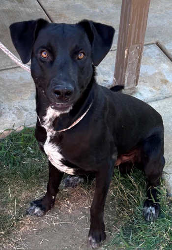 This 2-year-old female Labrador retriever mix has a black coat with white markings.